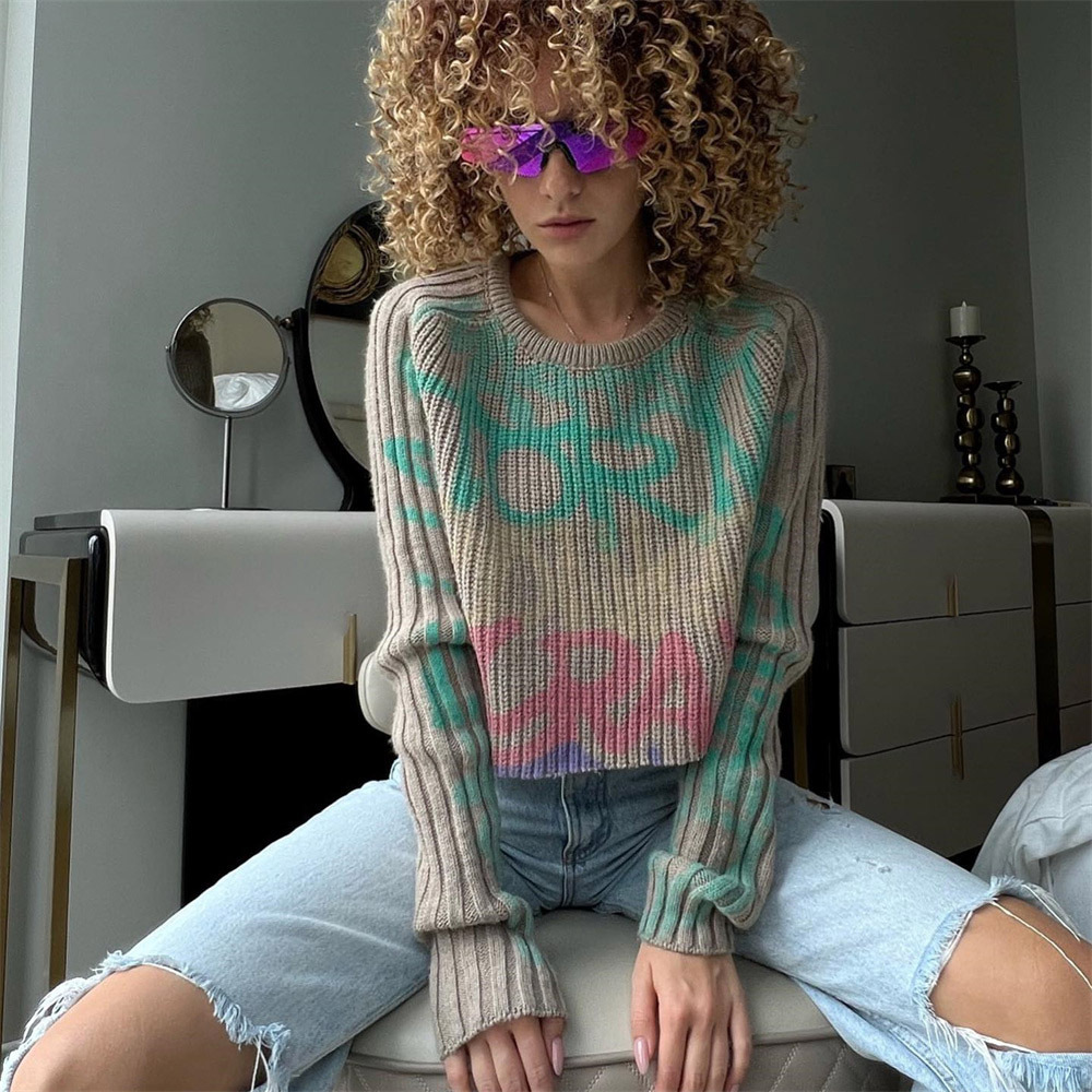 2pcs Striped Knitted Suits Long Sleeve Pullover Sweater And Elasticated Shorts Loose Women Clothing